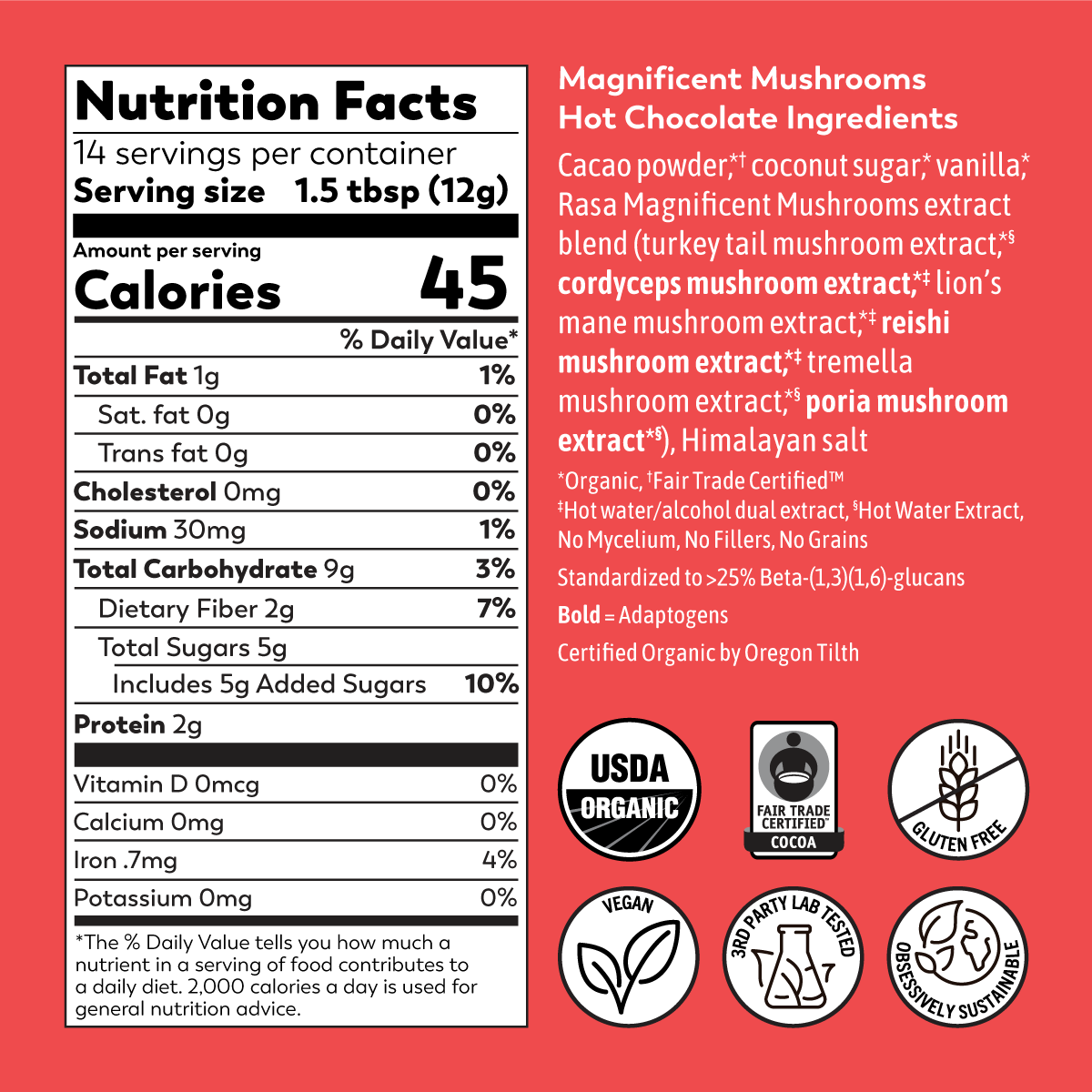 Our blend of six potent medicinal mushrooms is the perfect choice for wellness-focused people that still want a bit of chocolate: Turkey Tail for immune balance, Cordyceps for performance and immunity, Lion's Mane for mental agility, Reishi for equilibrium, Tremella for skin-beauty, and Poria for mood and relaxation. Regular use can give you a more balanced mood and even radiant skin!
